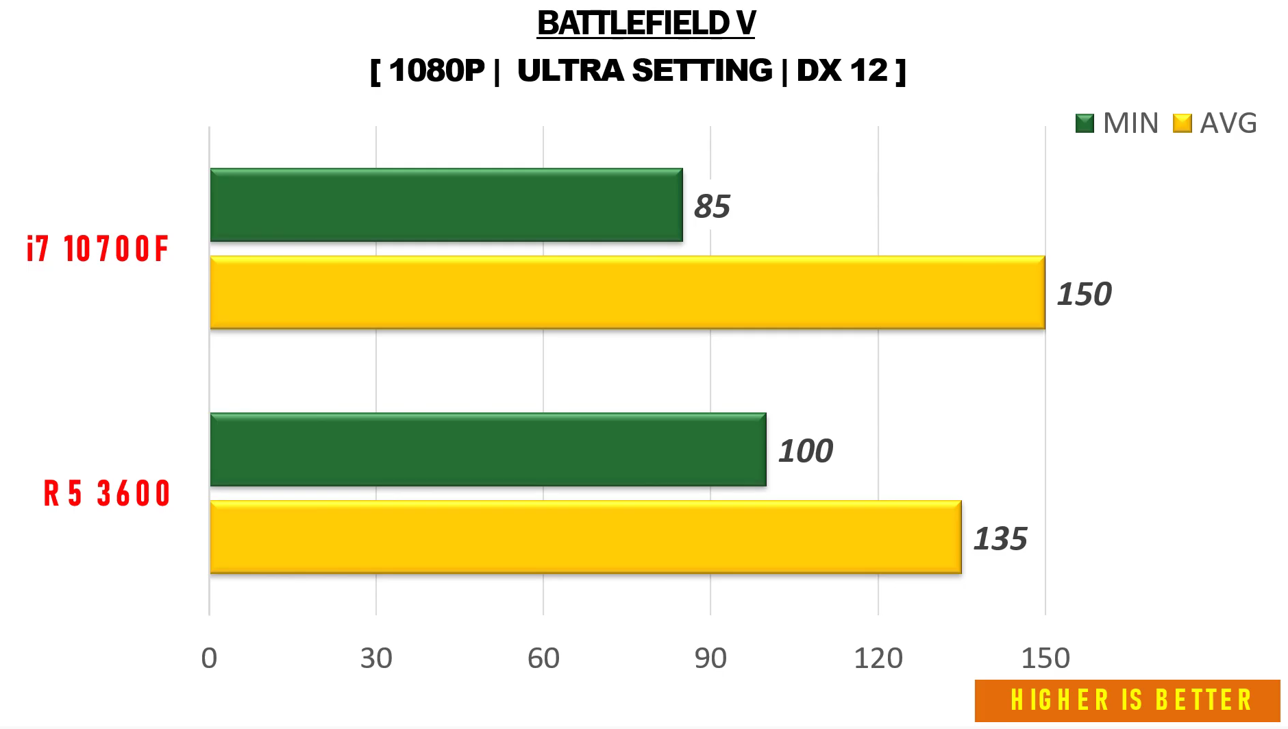 배틀필드 5 울트라에서 FHD 기준으로 각 평균 프레임은 135, 150으로 인텔 i7-10700F가 라이젠5 3600에 비해 약 11% 우세한 성능을 보여주었습니다.