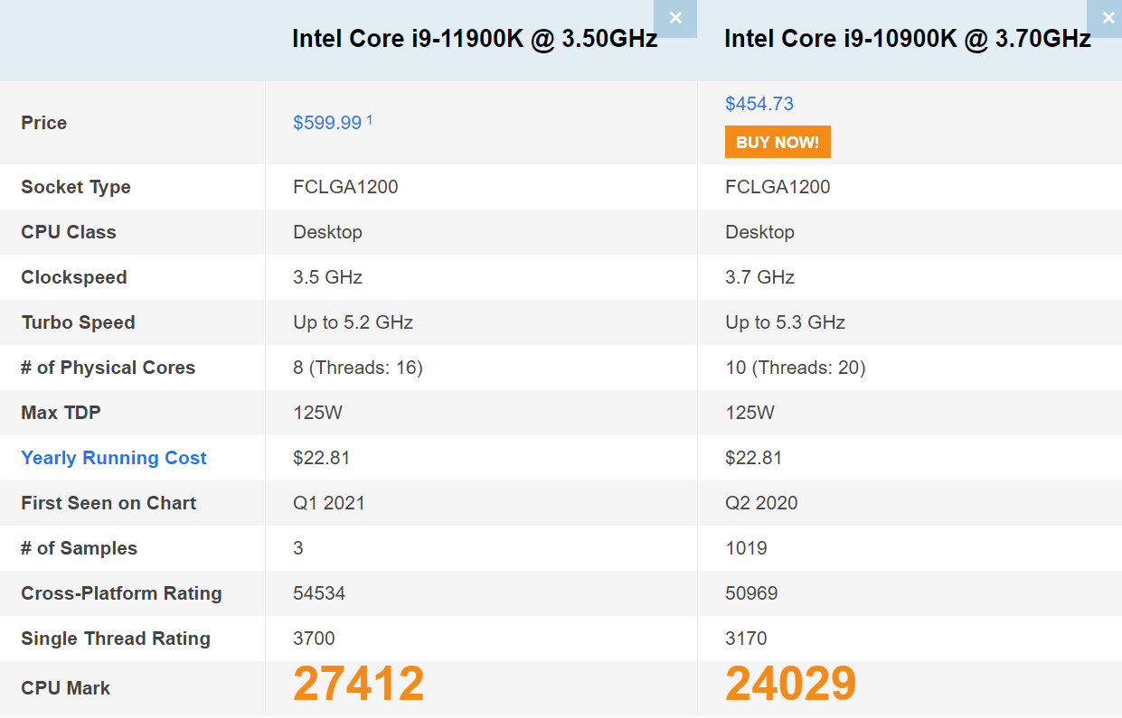 cpubenchmark.com에서 확인한 결과 인텔 i9-11900K가 인텔 i9-10900K 비해 약 14% 우세한 멀티 성능을 보여주었습니다.