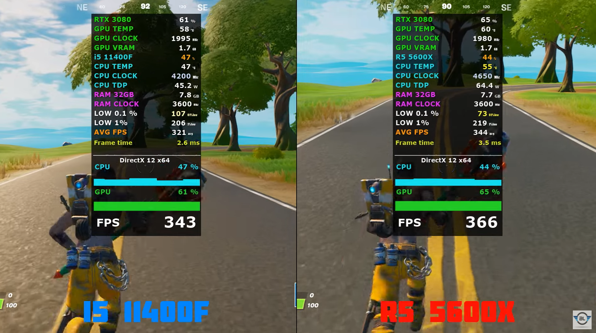 포트 나이트 낮음에서 FHD 기준으로 각 평균 프레임은 321, 344로 라이젠5 5600X가 인텔 i5-11400F 비해 약 7% 우세한 성능을 보여주었습니다.