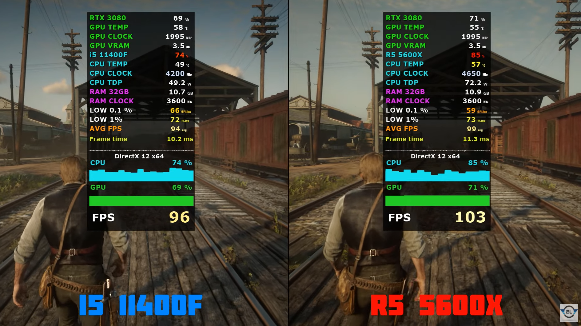 레드 데드 리뎀션 2 높음에서 FHD 기준으로 각 평균 프레임은 94, 99로 라이젠5 5600X가 인텔 i5-11400F 비해 약 5% 우세한 성능을 보여주었습니다.