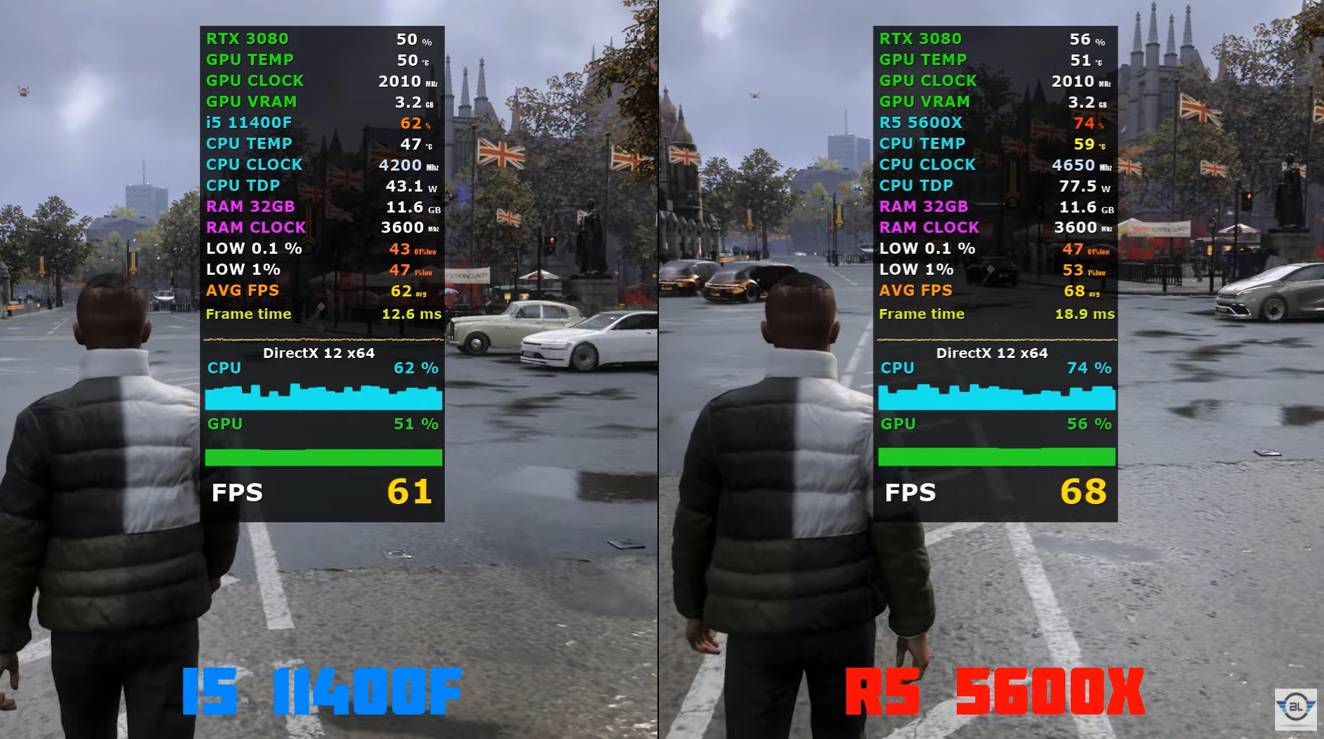 와치 독스 리전 울트라에서 FHD 기준으로 각 평균 프레임은 62, 68로 라이젠5 5600X가 인텔 i5-11400F 비해 약 10% 우세한 성능을 보여주었습니다.