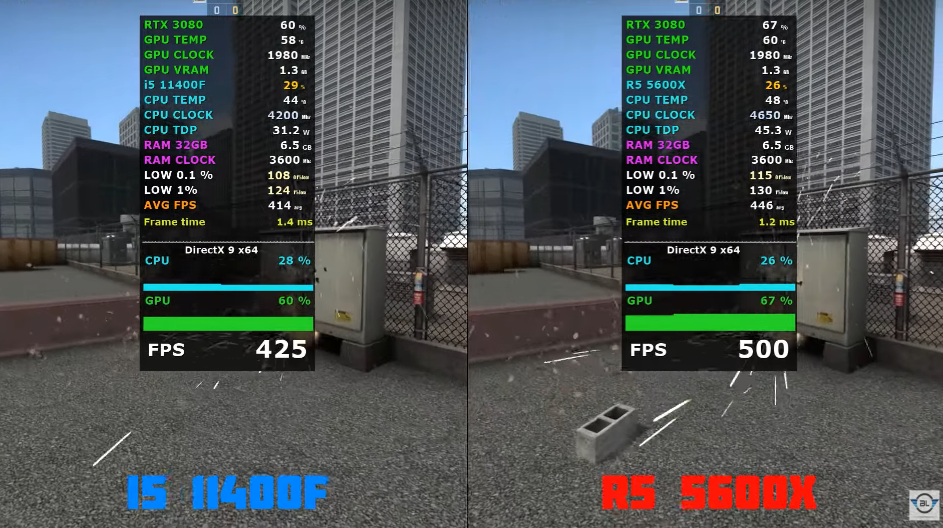 CSGO 중간에서 FHD 기준으로 각 평균 프레임은 414, 446으로 라이젠5 5600X가 인텔 i5-11400F 비해 약 8% 우세한 성능을 보여주었습니다.