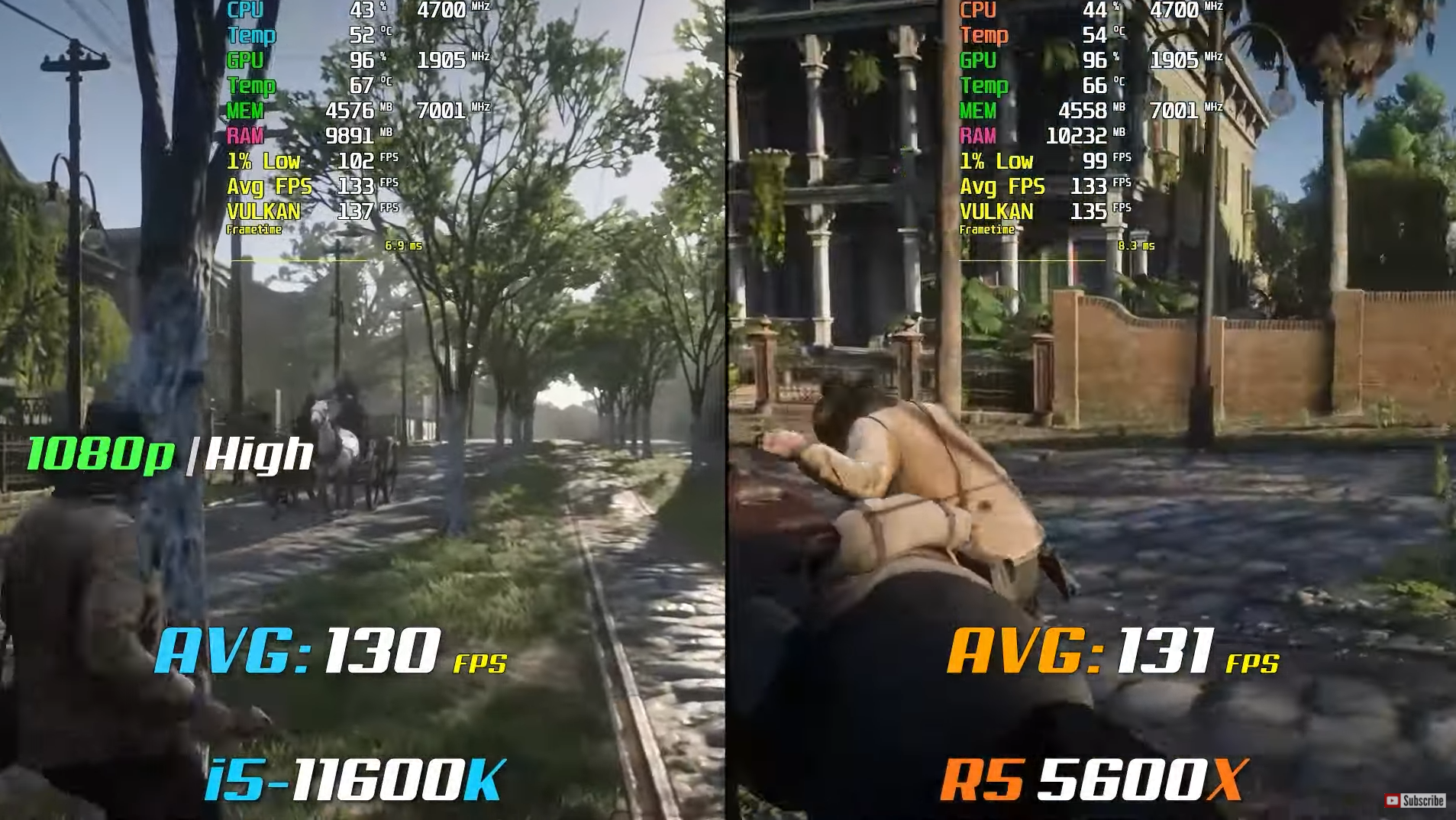 레드 데드 리뎀션 2 높음에서 FHD 기준으로 각 평균 프레임은 130, 131으로 라이젠5 5600X와 인텔 i5-11600K은 비슷한 성능을 보여주었습니다.