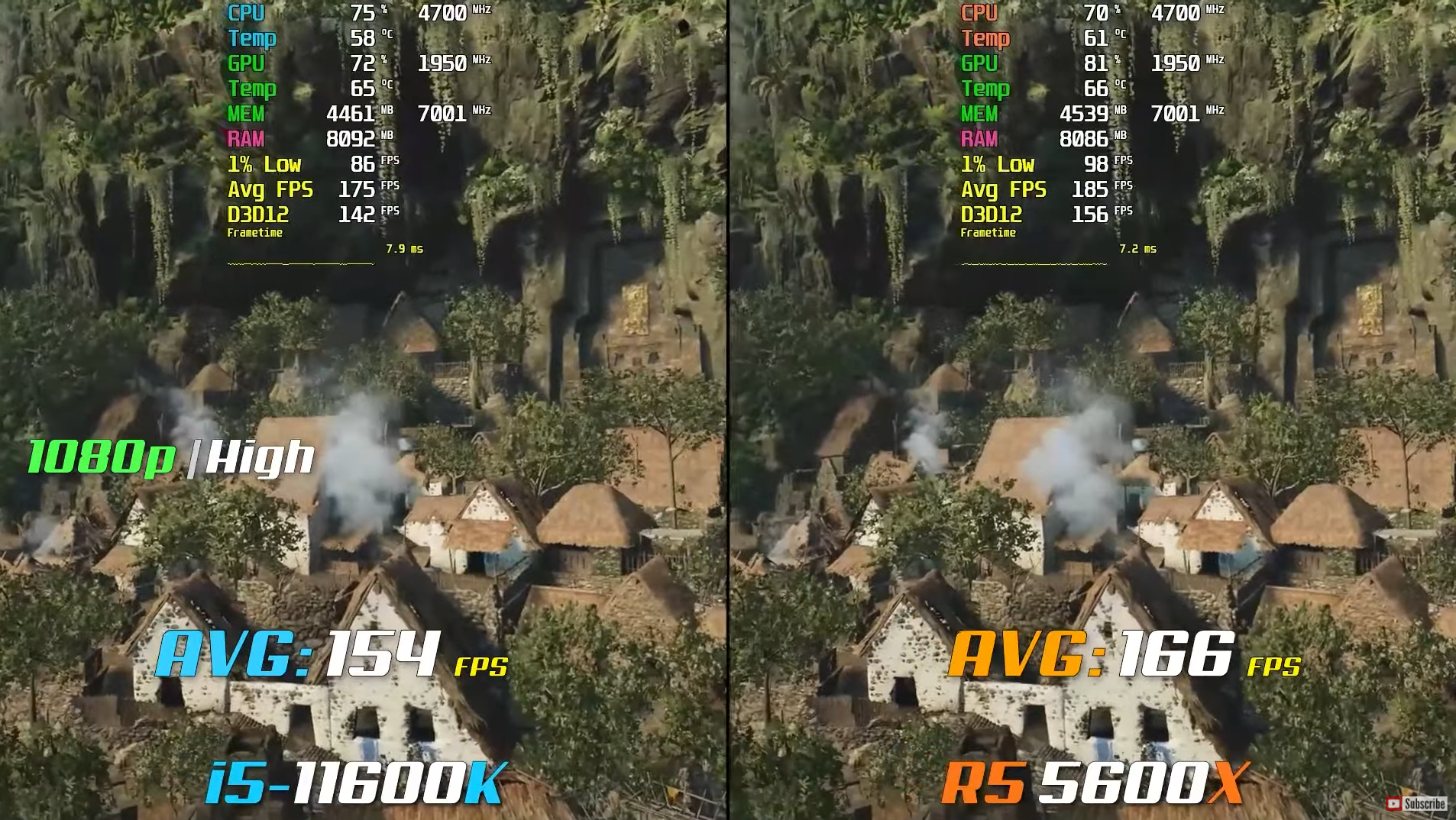 쉐도우 오브 더 툼레이더 높음에서 FHD 기준으로 각 평균 프레임은 154, 166으로 라이젠5 5600X가 인텔 i5-11600K 비해 약 8% 우세한 성능을 보여주었습니다.