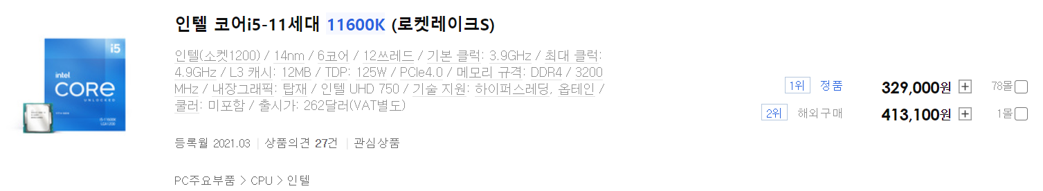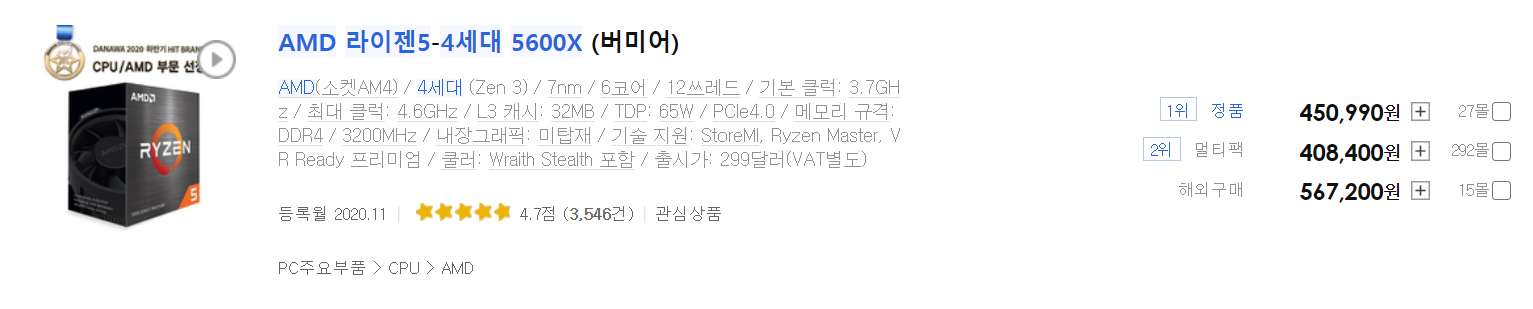 329,000(11600K, 정품) vs 408,400(5600X, 멀티팩)