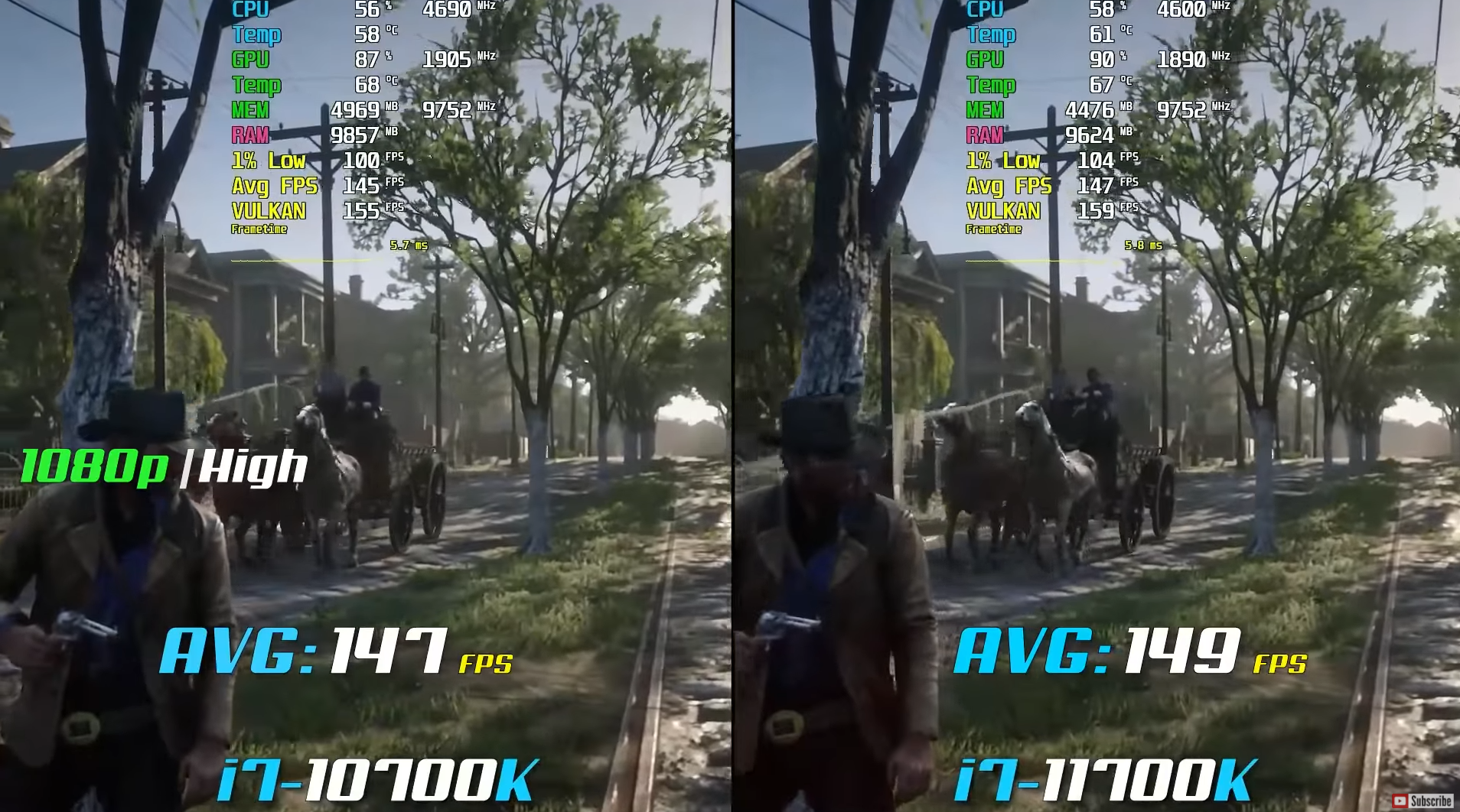레드 데드 리뎀션 2 높음에서 FHD 기준으로 각 평균 프레임은 147, 149로 인텔 i7-11700K과 인텔 i7-10700K는 비슷한 성능을 보여주었습니다.