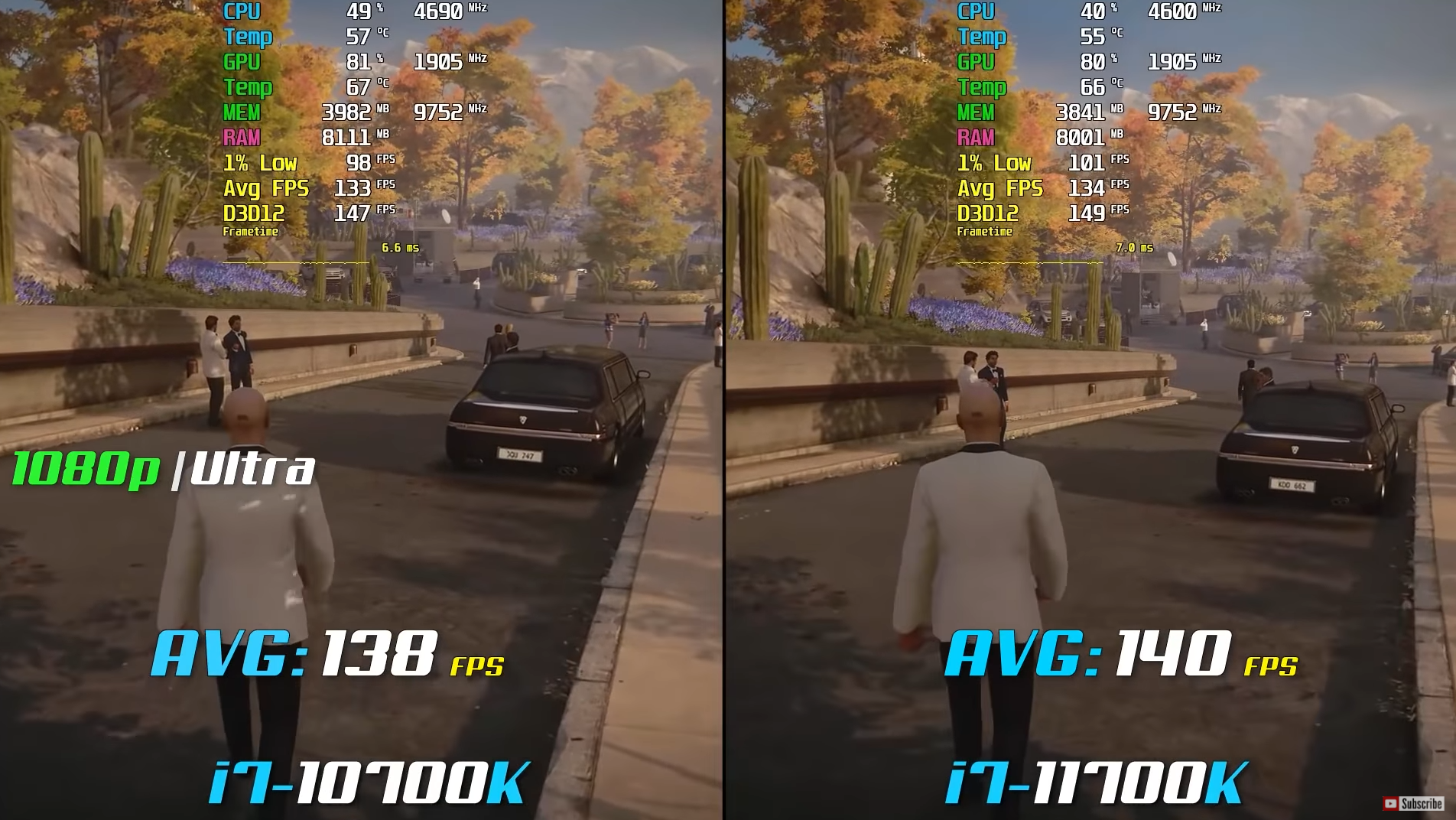 히트맨 3 울트라에서 FHD 기준으로 각 평균 프레임은 138, 140으로 인텔 i7-11700K과 인텔 i7-10700K는 비슷한 성능을 보여주었습니다.