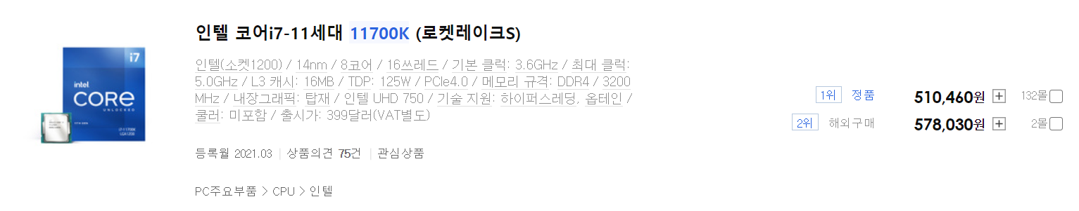 381,100원(10700K, 정품) vs 510,460(11700K, 정품)