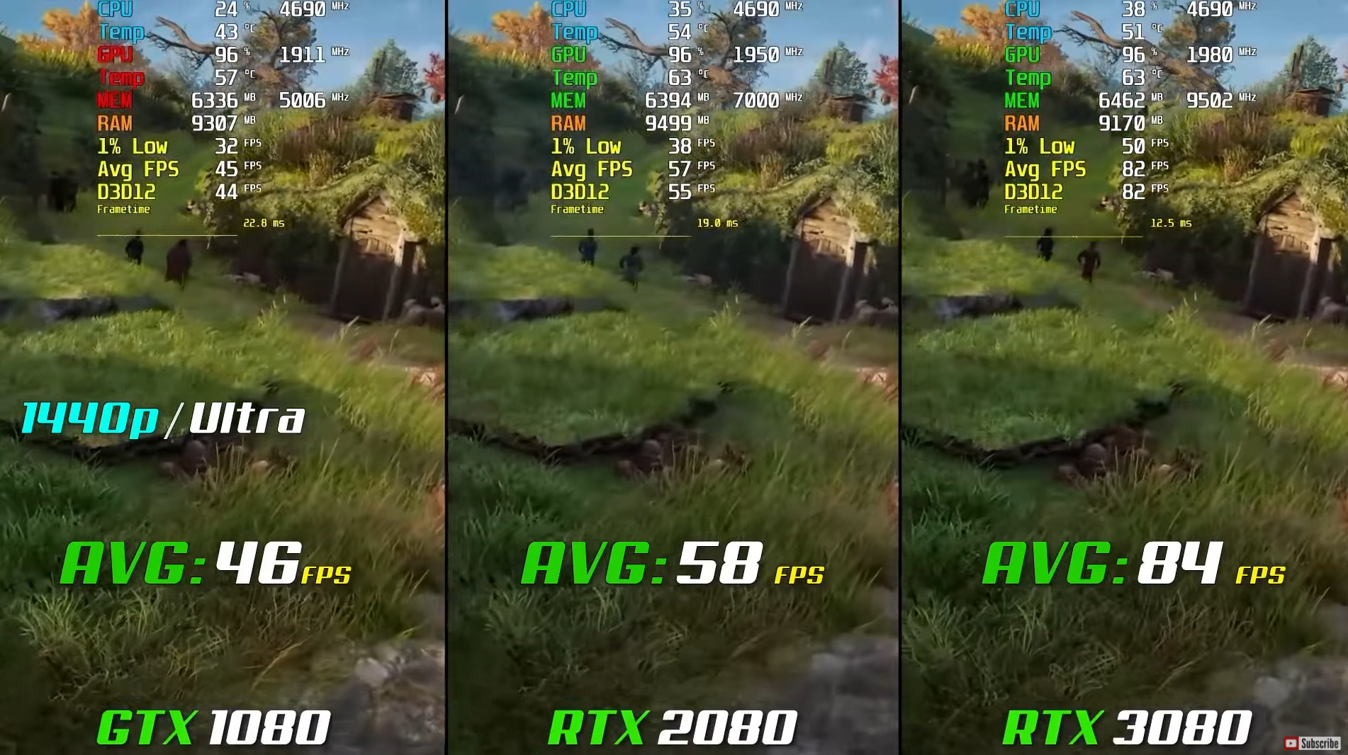 어쌔신 크리드 발할라 울트라에서 QHD 기준으로 각 평균 프레임은 46, 58, 84으로 RTX2080은 GTX1080 대비 약 26%, RTX3080은 RTX2080 대비 약 44% 우세한 성능을 보여주었습니다.