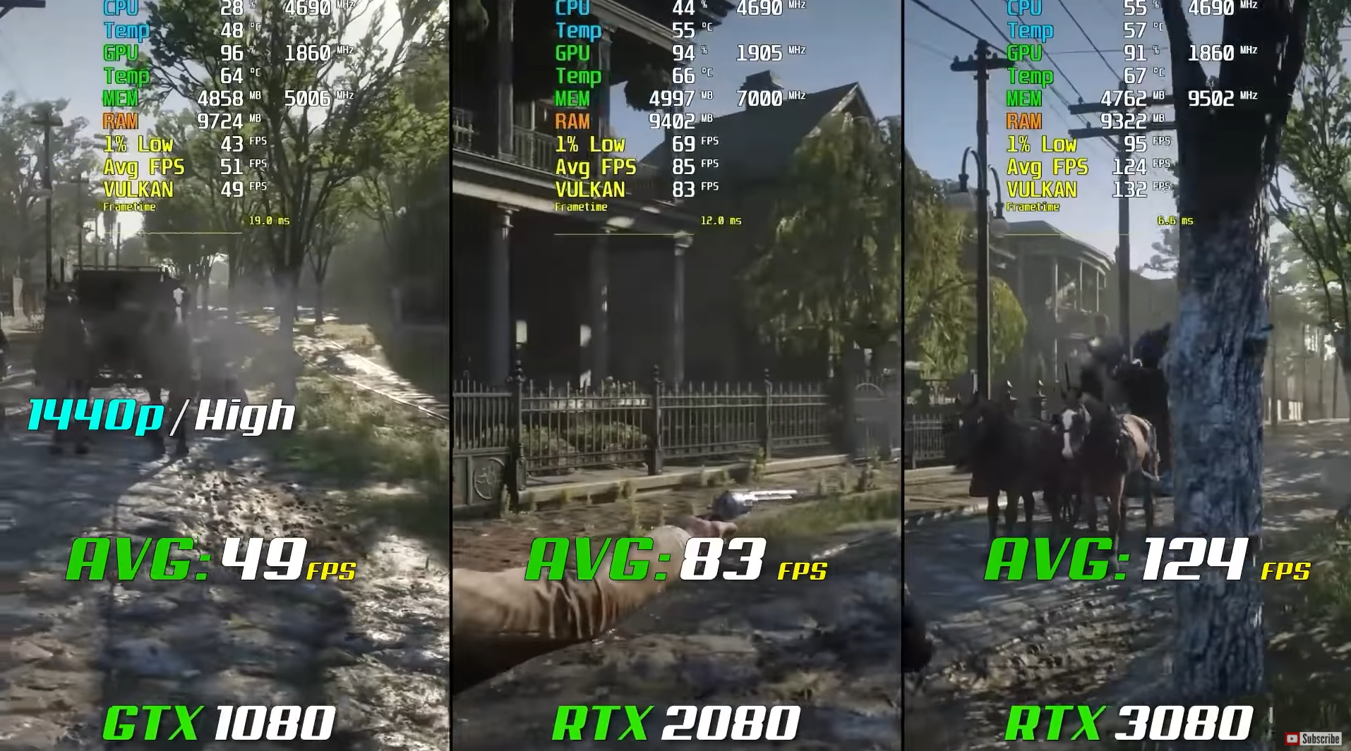 레드 데드 리뎀션 2 높음에서 QHD 기준으로 각 평균 프레임은 49, 83, 124으로 RTX2080은 GTX1080 대비 약 69%, RTX3080은 RTX2080 대비 약 50% 우세한 성능을 보여주었습니다.