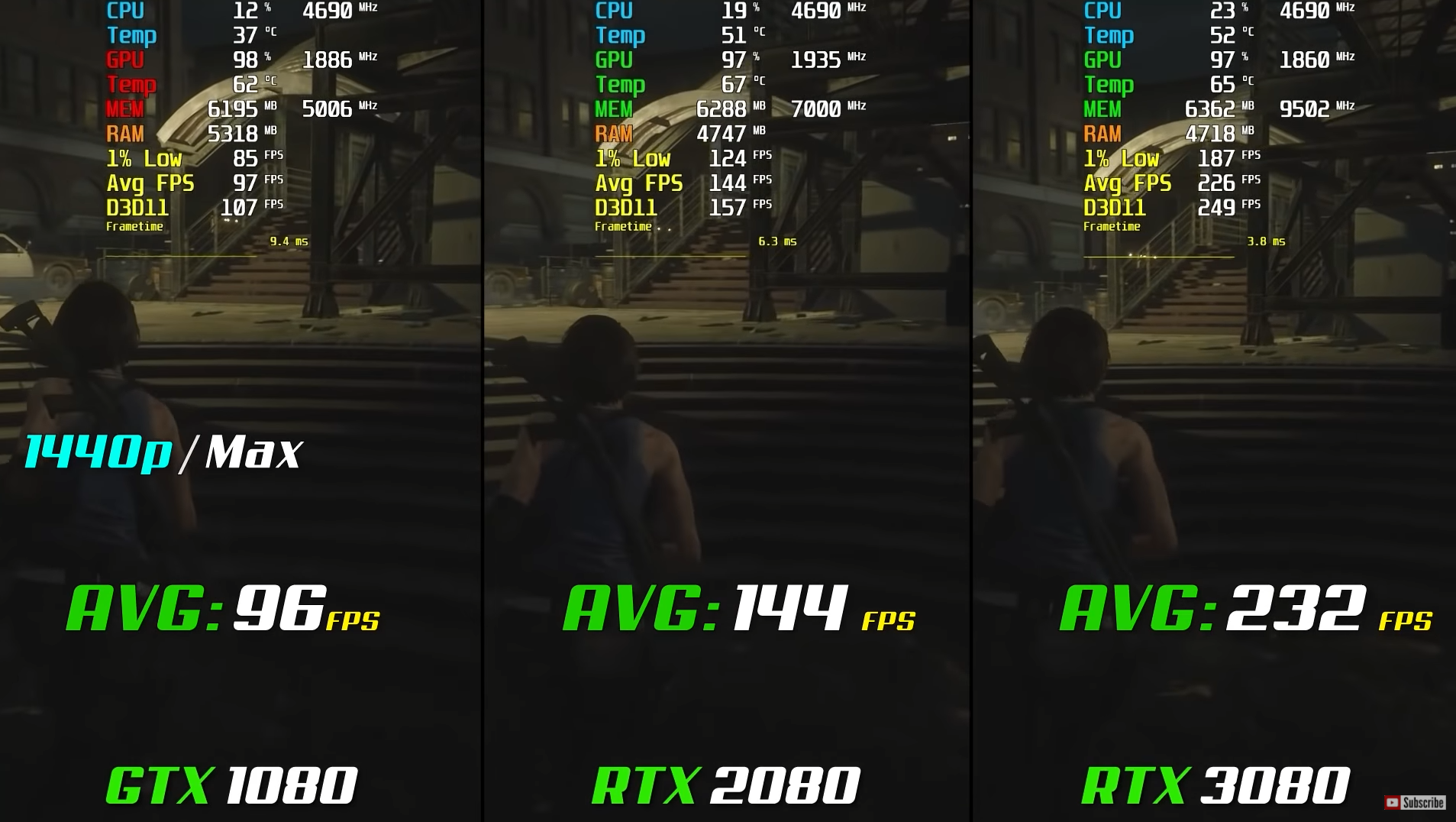 레지던트 이블 3 풀 옵션에서 QHD 기준으로 각 평균 프레임은 96, 144, 232으로 RTX2080은 GTX1080 대비 약 50%, RTX3080은 RTX2080 대비 약 60% 우세한 성능을 보여주었습니다.