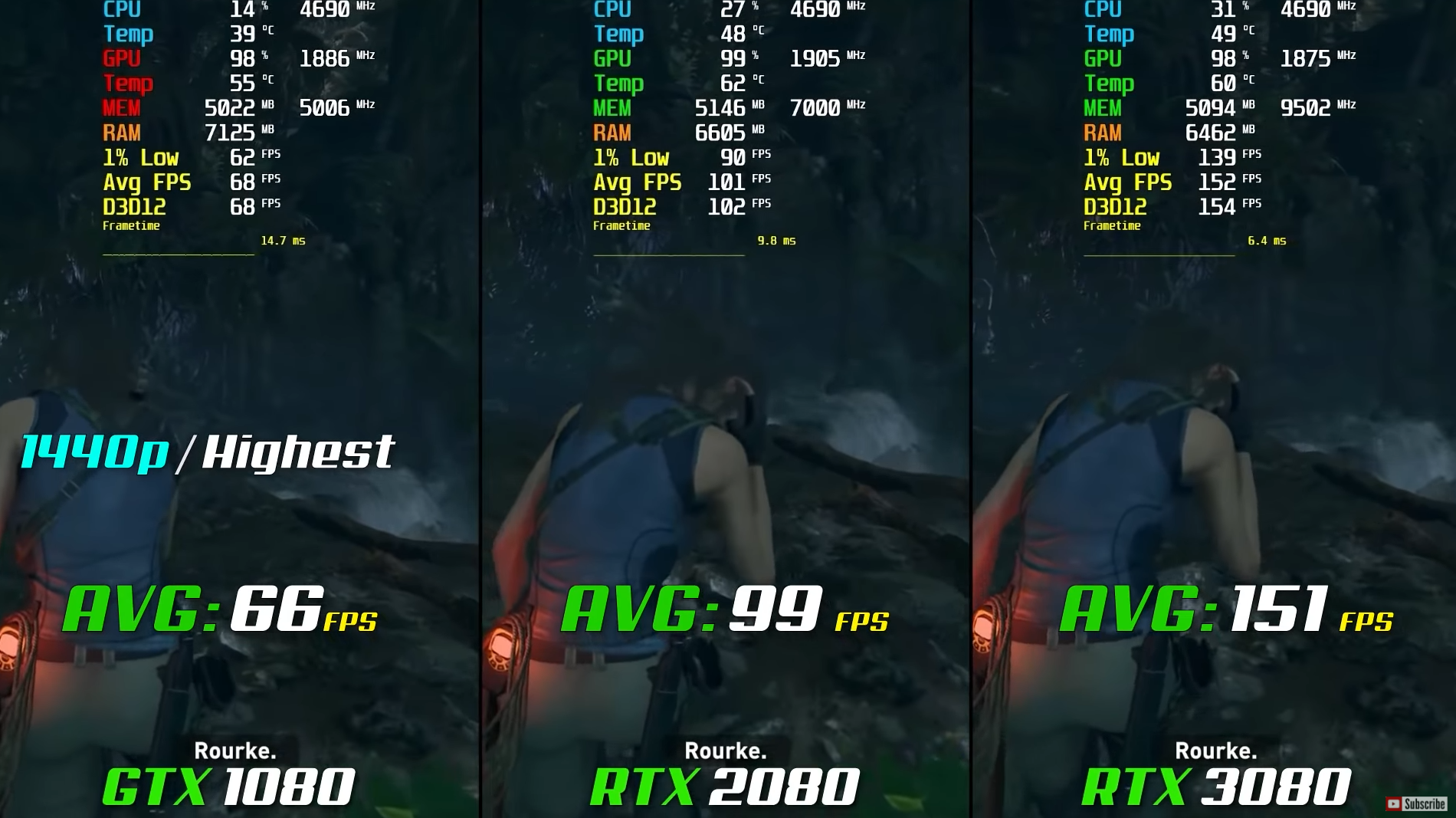 쉐도우 오브 더 툼레이더 가장 높음에서 QHD 기준으로 각 평균 프레임은 66, 99, 151으로 RTX2080은 GTX1080 대비 약 50%, RTX3080은 RTX2080 대비 약 52% 우세한 성능을 보여주었습니다.