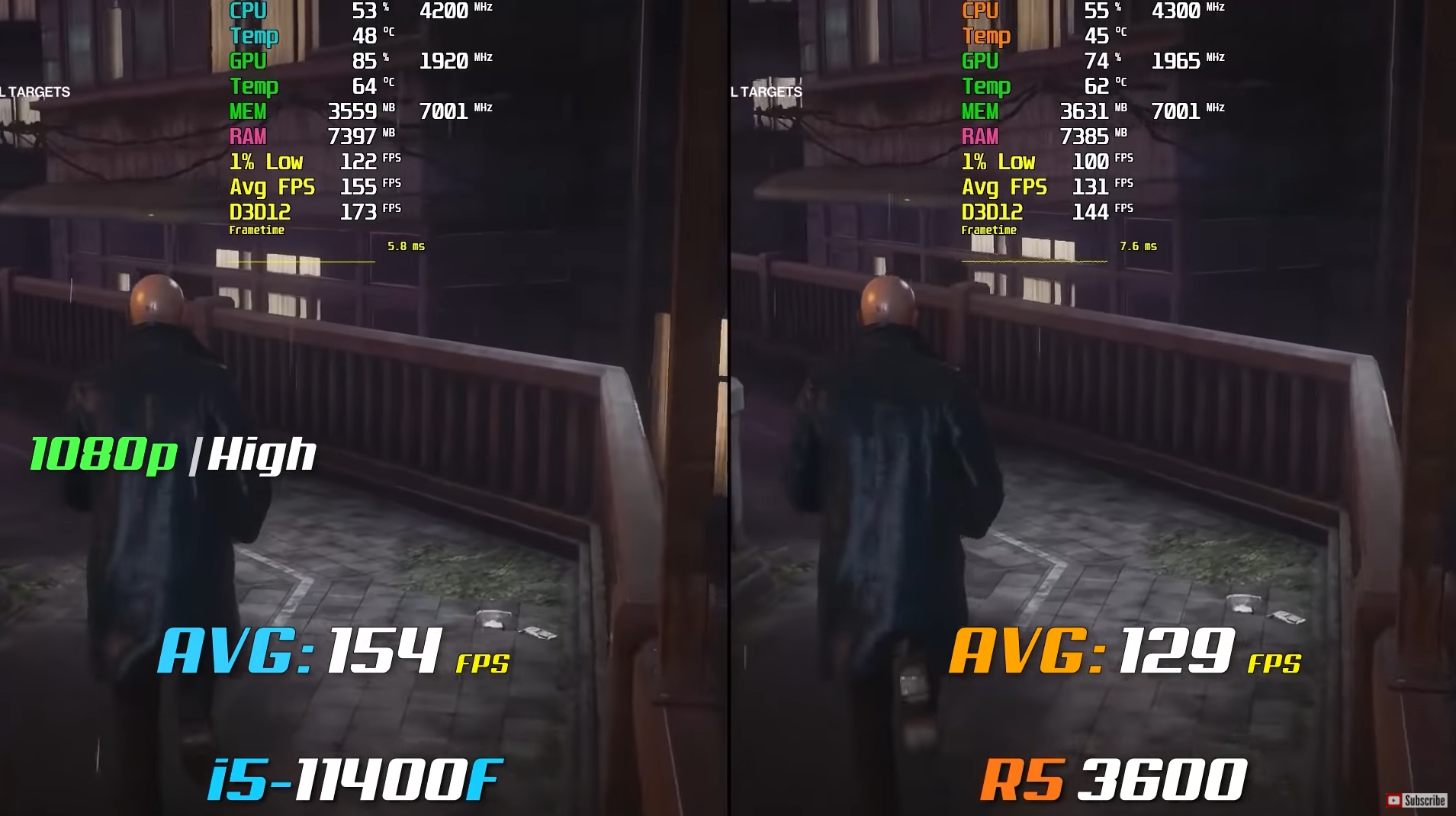 히트맨 3 높음에서 FHD 기준으로 각 평균 프레임은 154, 129로 인텔 i5-11400F가 라이젠5 3600에 비해 약 19% 우세한 성능을 보여주었습니다.