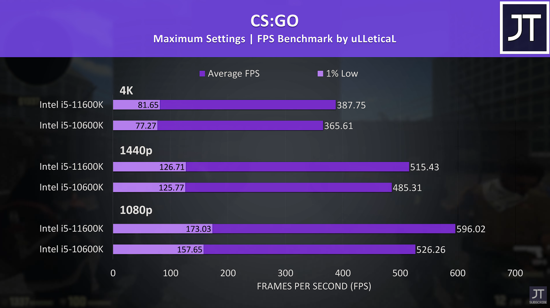 카운터 스트라이크 풀 옵션에서 FHD 기준으로 각 평균 프레임은 596, 526으로 인텔 i5-11600K가 인텔 i5-10600K 비해 약 13% 우세한 성능을 보여주었습니다.