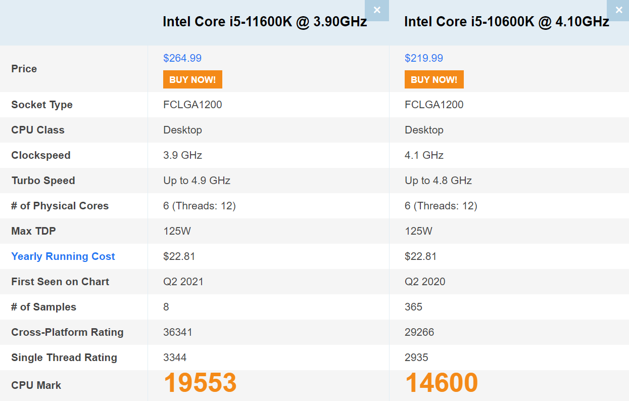 cpubenchmark.com에서 확인한 결과 인텔 i5-11600K가 i5-10600K보다 약 33% 우세한 멀티 성능을 보여주었습니다.