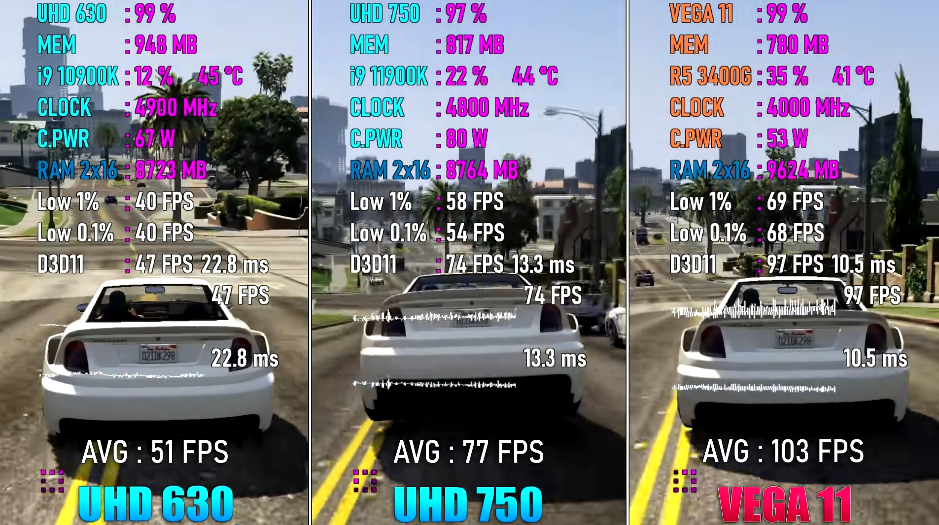 GTA 5 낮음에서 1600*900 기준으로 각 평균 프레임은 51, 77, 103으로 UHD 750이 UHD 630보다 약 50%, Vega 11이 UHD 750보다 약 33% 우세한 성능을 보여주었습니다.