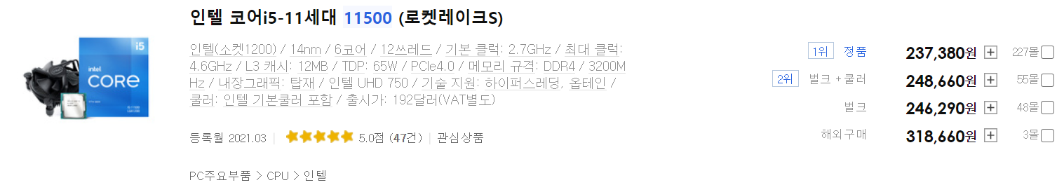 2021.04.12 기준으로 UHD630을 가진 인텔 i5-10400은 208,920원, 인텔 UHD 750를 가진 내장 그래픽 중 가장 낮은 성능을 가진 인텔 i5-11500의 가격은 237,380원, 중고나라에서 거래되는 라이젠 3400G의 가격은 약 13만원 입니다.