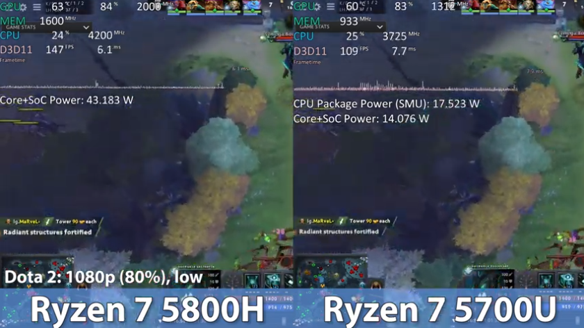 도타 2 낮음에서 FHD(80%) 기준으로 각 프레임은 147, 109로 라이젠7 5800H가 라이젠7 5700U보다 약 34% 우세한 성능을 보여주었습니다.