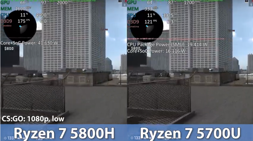 카운터 스트라이크 낮음에서 FHD 기준으로 각 프레임은 175, 121로 라이젠7 5800H가 라이젠7 5700U보다 약 44% 우세한 성능을 보여주었습니다.