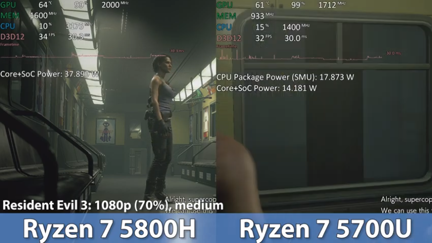 레지던트 이블 3 중간에서 FHD(80%) 기준으로 각 프레임은 34, 32로 라이젠7 5800H가 라이젠7 5700U보다 약 6% 우세한 성능을 보여주었습니다.