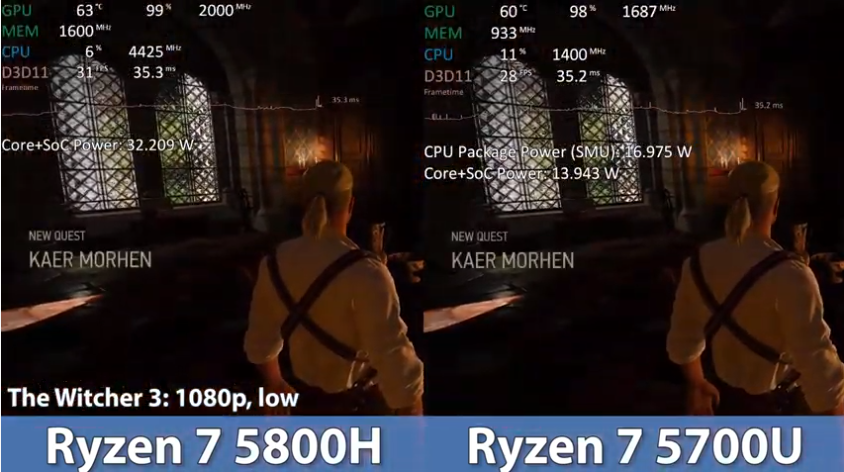 더 위쳐 3 낮음에서 FHD 기준으로 각 프레임은 31, 28로 라이젠7 5800H가 라이젠7 5700U보다 약 10% 우세한 성능을 보여주었습니다.