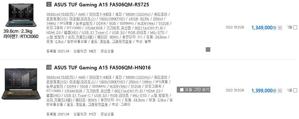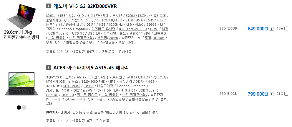 가격을 보시면 눈치를 채셨겠지만, 라이젠 5800H는 외장 그래픽과 같이 탑재되어 나온 모델밖에 없기 때문에 가격 차이가 2배 정도 나는 것을 확인할 수 있습니다.