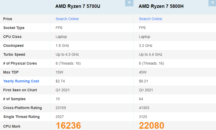 cpubenchmark.com에 따르면 라이젠7 5800H이 라이젠7 5700U보다 약 36% 우세한 멀티 성능을 보여주고 있습니다.