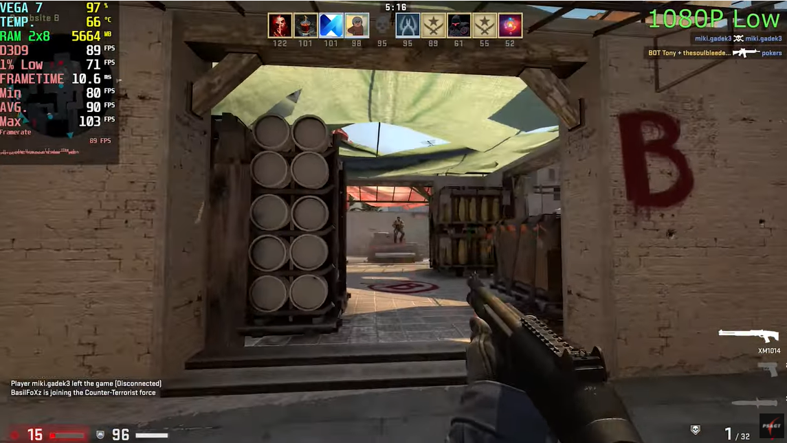CS:GO 낮음에서 FHD 기준으로 평균 프레임이 90이 나왔습니다. 라이젠 5500U로 CS:GO 같은 저사양 게임에서는 무리 없이 구동되는 모습을 보여주고 있습니다.
