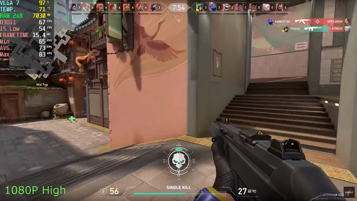 발로란트 높음에서 FHD 기준으로 평균 프레임이 73이 나왔습니다. 발로란트도 대표적인 저사양 게임으로 높은 사양에서 구동해도 무리 없는 프레임을 보여주고 있습니다.