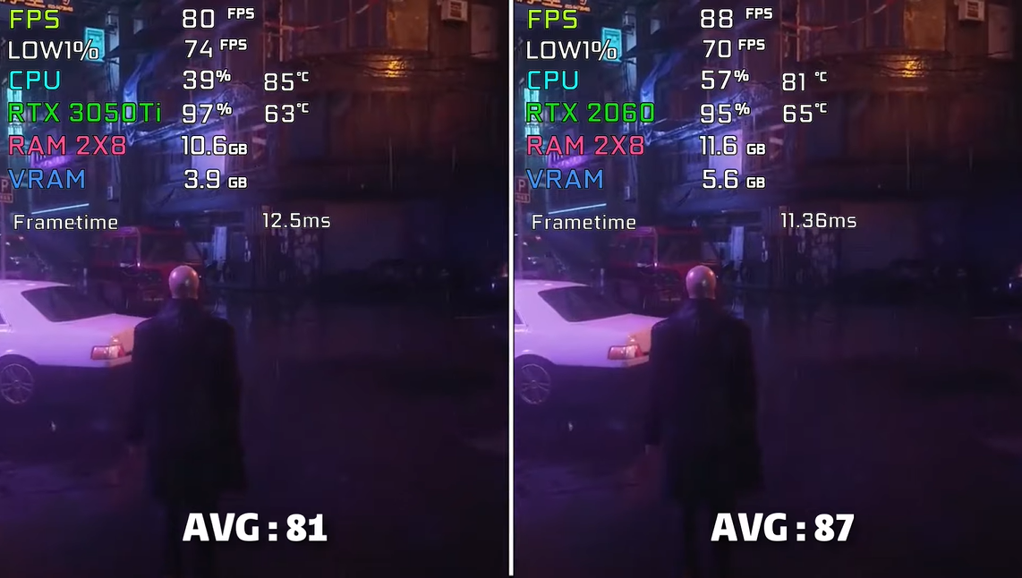 히트맨 3 높음에서 돌렸을 때 FHD 기준으로 각 평균 프레임은 81, 87으로 RTX2060이 RTX3050 Ti보다 약 7% 우세한 성능을 보여주었습니다.
