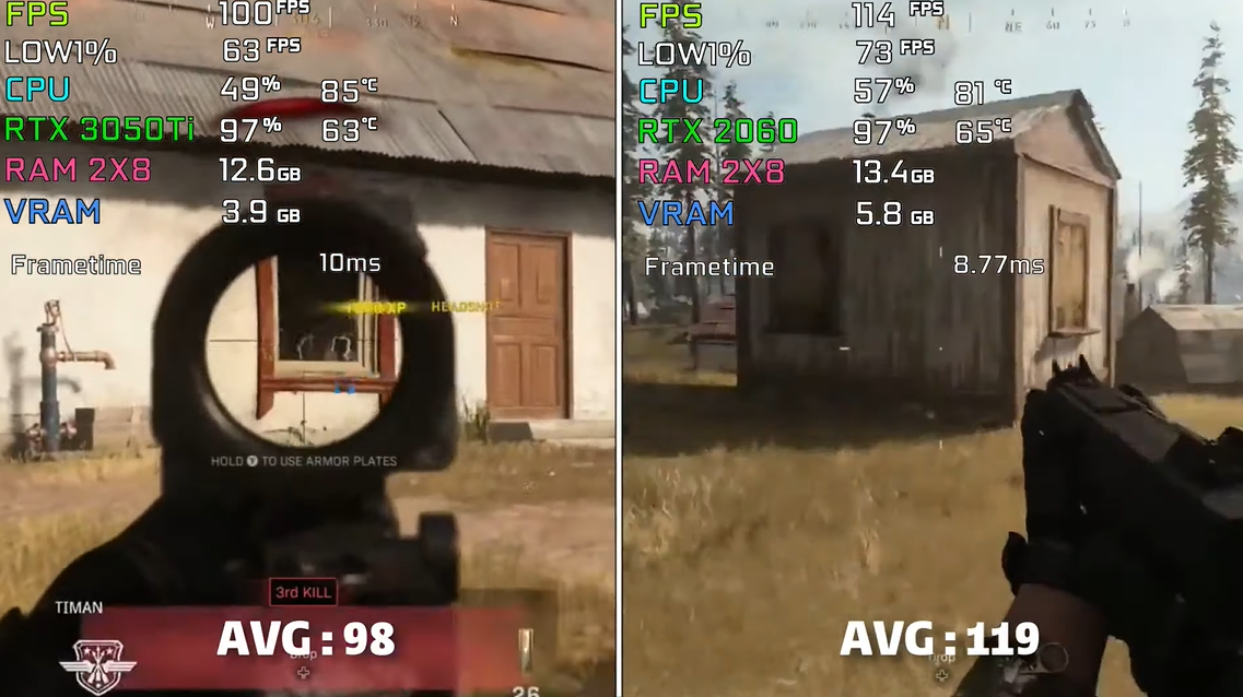 콜 오브 듀티 워존 높음에서 돌렸을 때 FHD 기준으로 각 평균 프레임은 98, 119로 RTX2060이 RTX3050 Ti보다 약 21% 우세한 성능을 보여주었습니다.