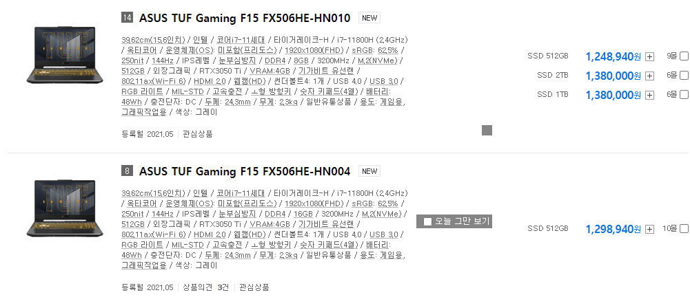 모델에 따라 편차가 있지만 최저가 기준으로 RTX2060이 10만원 더 저렴한 모습을 보여주고 있습니다. 그렇지만 RTX3060의 CPU를 보면 i7-11800H로 최신 CPU를 사용하고 있기 때문에 사실 상 거의 비슷하다고 볼 수 있겠네요.