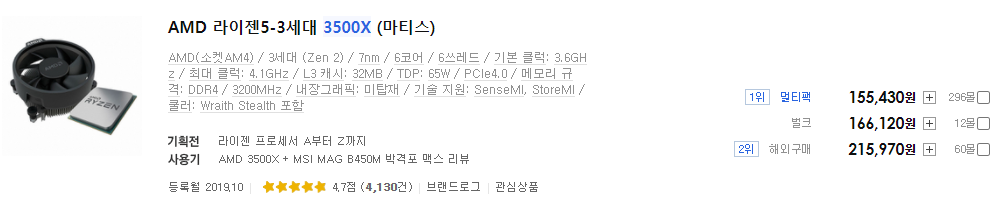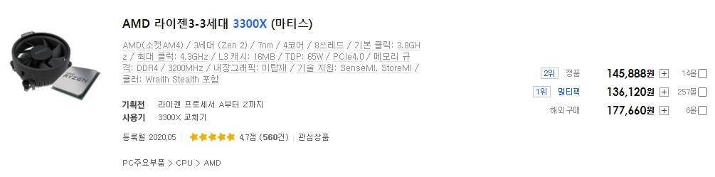 개인적으로 PC를 한번 맞추면 계속 쓰기 때문에 라이젠 3300X에서 6만원을 더 주면 2코어 4쓰레드를 얻을 수 있는 라이젠 3600이 더 나은 것 같네요.