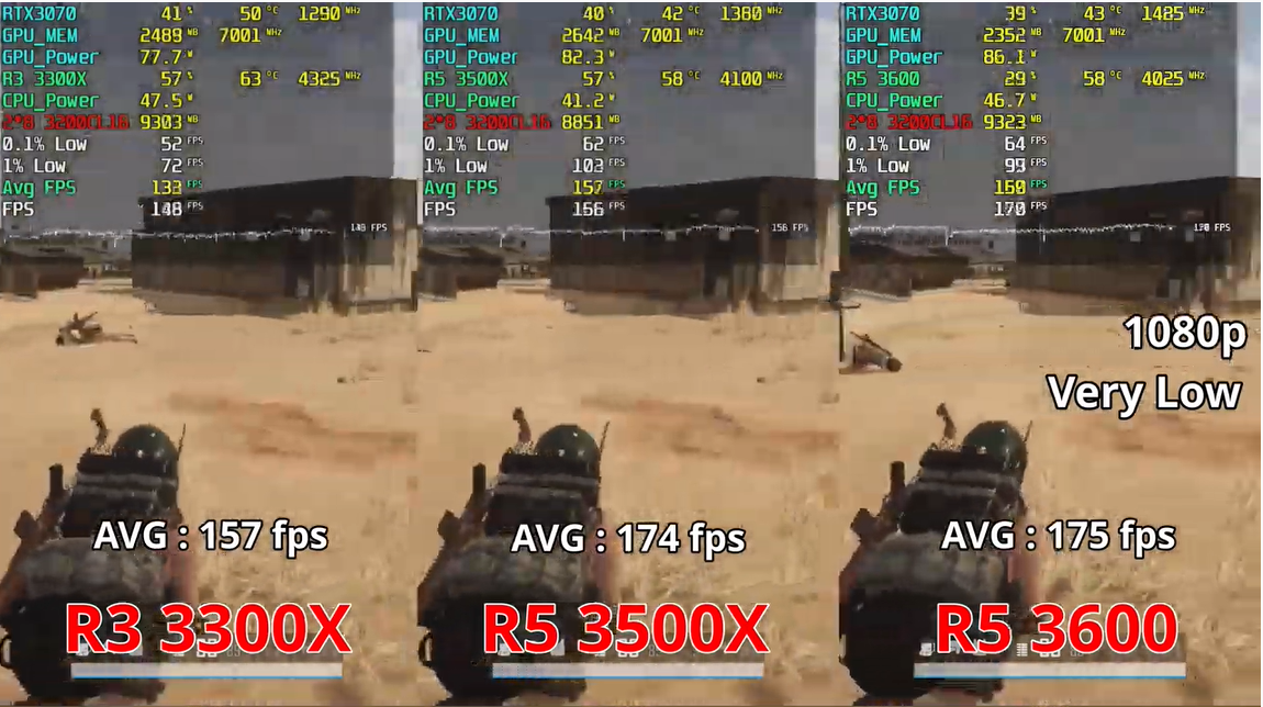 배틀그라운드 매우 낮음에서 FHD 기준으로 각 평균 프레임은 157, 174, 175로 라이젠 3500X와 3600은 서로 비슷한 성능을 보여주었지만 라이젠 3500X은 3300X에 비해 약 10% 우세한 성능을 보여주었습니다.