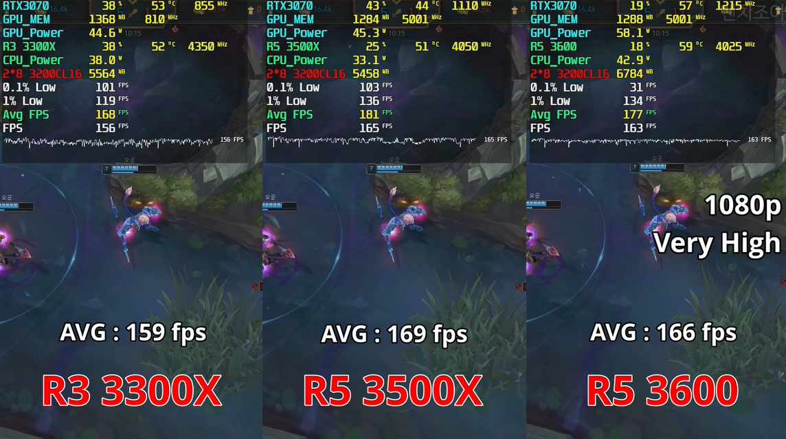 리그 오브 레전드 매우 높음에서 FHD 기준으로 각 평균 프레임은 159, 169, 166으로 차이가 거의 나지 않고 거의 동급의 성능을 보여주었습니다.