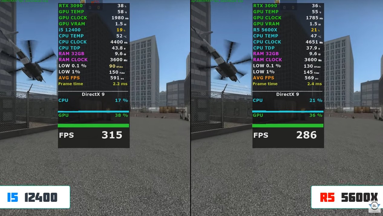 CSGO 중간에서 FHD 기준으로 각 평균 프레임은 591, 569으로 인텔 i5-12400F가 라이젠 5600X 비해 약 6% 우세한 성능을 보여주었습니다.