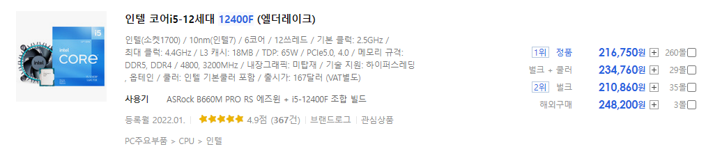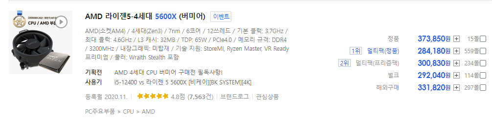 216,750(12400F, 정품) vs 284,180(5600X, 멀티팩)