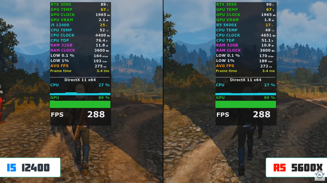 더 위쳐 3 높음에서 FHD 기준으로 각 평균 프레임은 193, 189로 인텔 i5-12400F가 라이젠 5600X 비해 소폭 앞서는성능을 보여주었습니다.