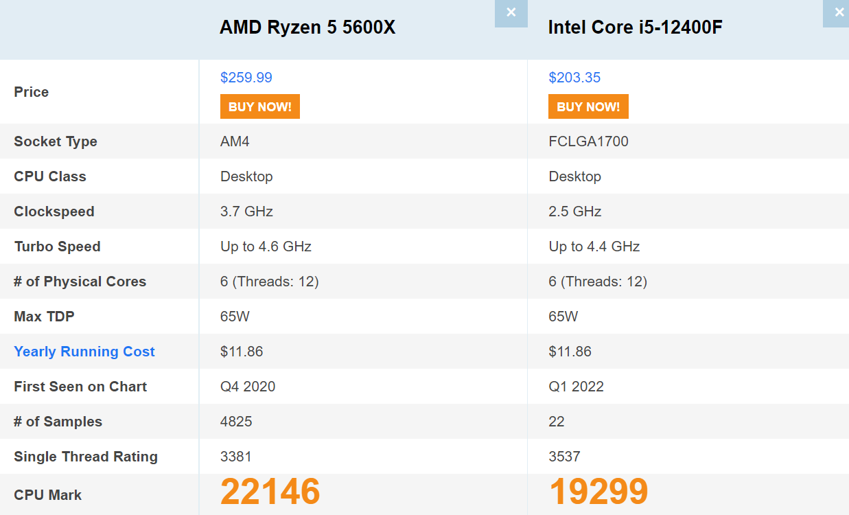 CPUbenchmark 사이트에서 비교 결과 멀티 성능에 있어서 라이젠 5600X가 인텔 i5-12400F보다 약 13% 우세한 것을 확인할 수 있습니다.