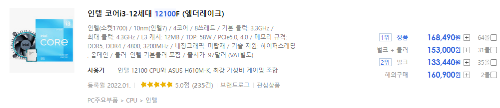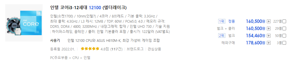 분명 출시가에서는 i3-12100F가 약 3만원 정도 싼 것으로 나왔는데 오히려 출시가가 더 비싼 i3-12100가 더 싼 아이러니한 상황이 연출되네요.