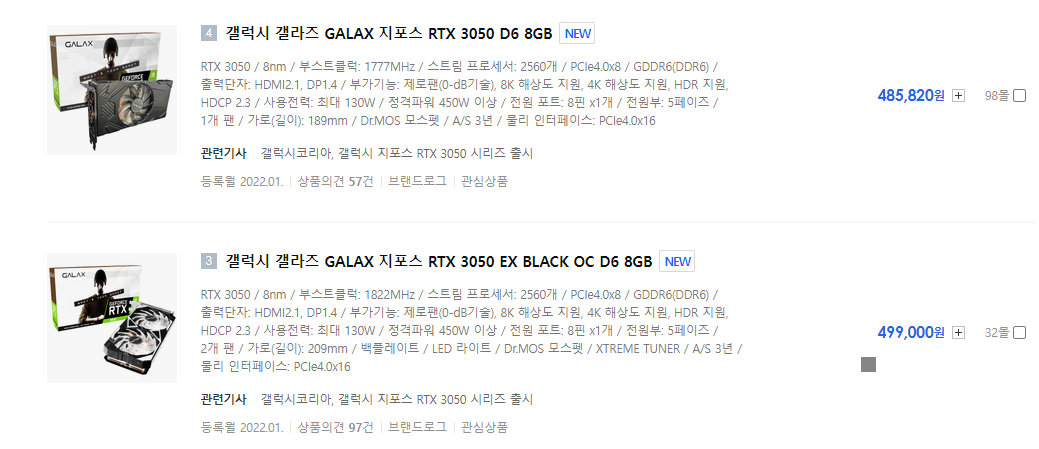 약 50만원 (RTX3050) vs 약 64만원 (RTX3050)