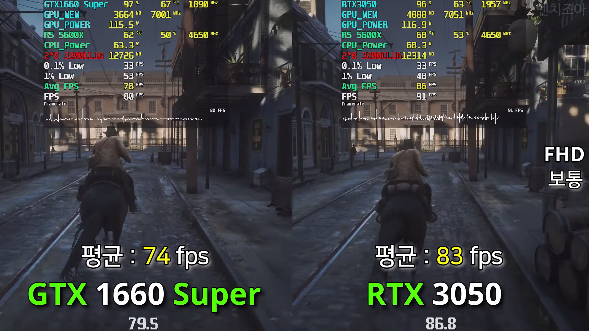 레드 데드 리뎀션 2 보통 FHD으로 각 평균 프레임은 74, 83으로 RTX3050이 GTX1660 Super보다 약 10% 우세한 성능 차이를 보여주었습니다.