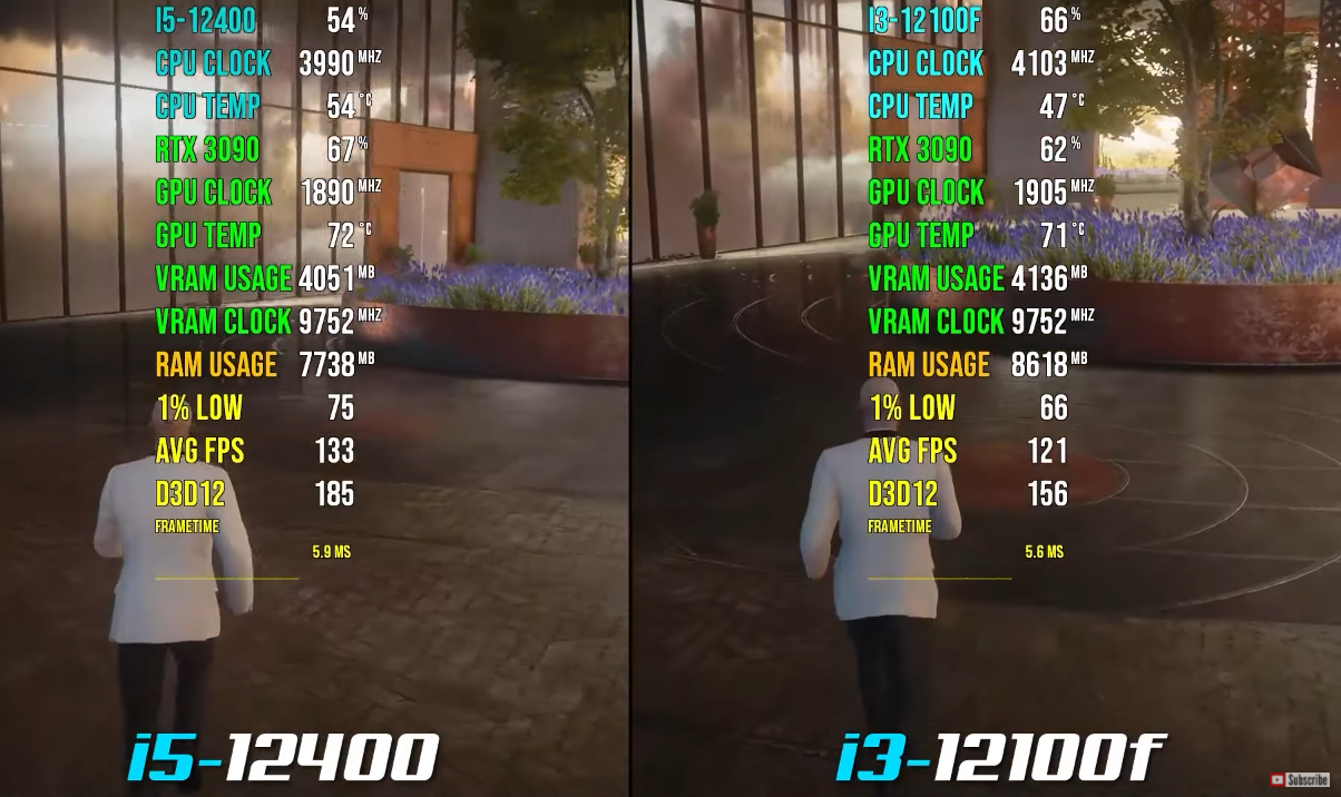 히트맨 3 FHD 기준으로 각 평균 프레임은 133, 121로 인텔 i5-12400F가 인텔 i3-12100F 비해 약 10% 우세한 성능을 보여주었습니다.