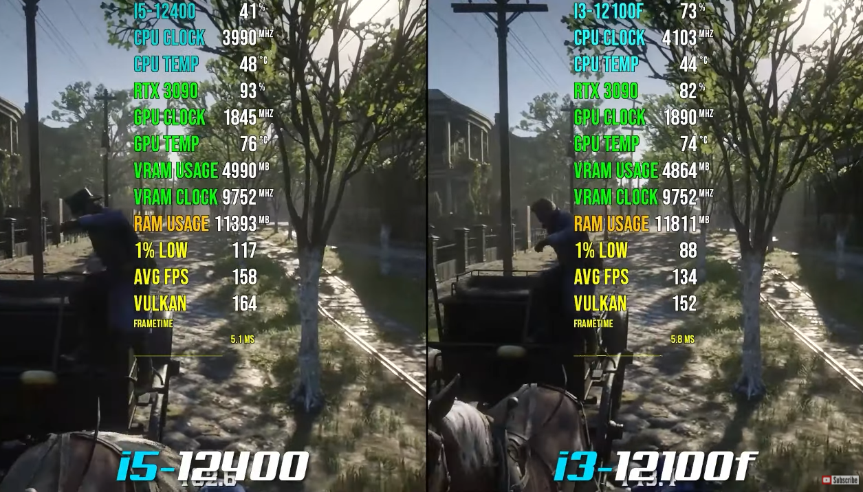 레드 데드 리뎀션 FHD으로 각 평균 프레임은 158, 134으로 인텔 i5-12400F가 인텔 i3-12100F 비해 약 15% 우세한 성능을 보여주었습니다.
