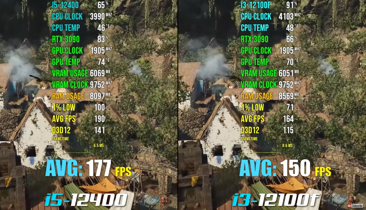 쉐도우 오브 더 툼레이더 FHD 기준으로 각 평균 프레임은 177, 150로 인텔 i5-12400F가 인텔 i3-12100F 비해 약 15% 우세한 성능을 보여주었습니다.