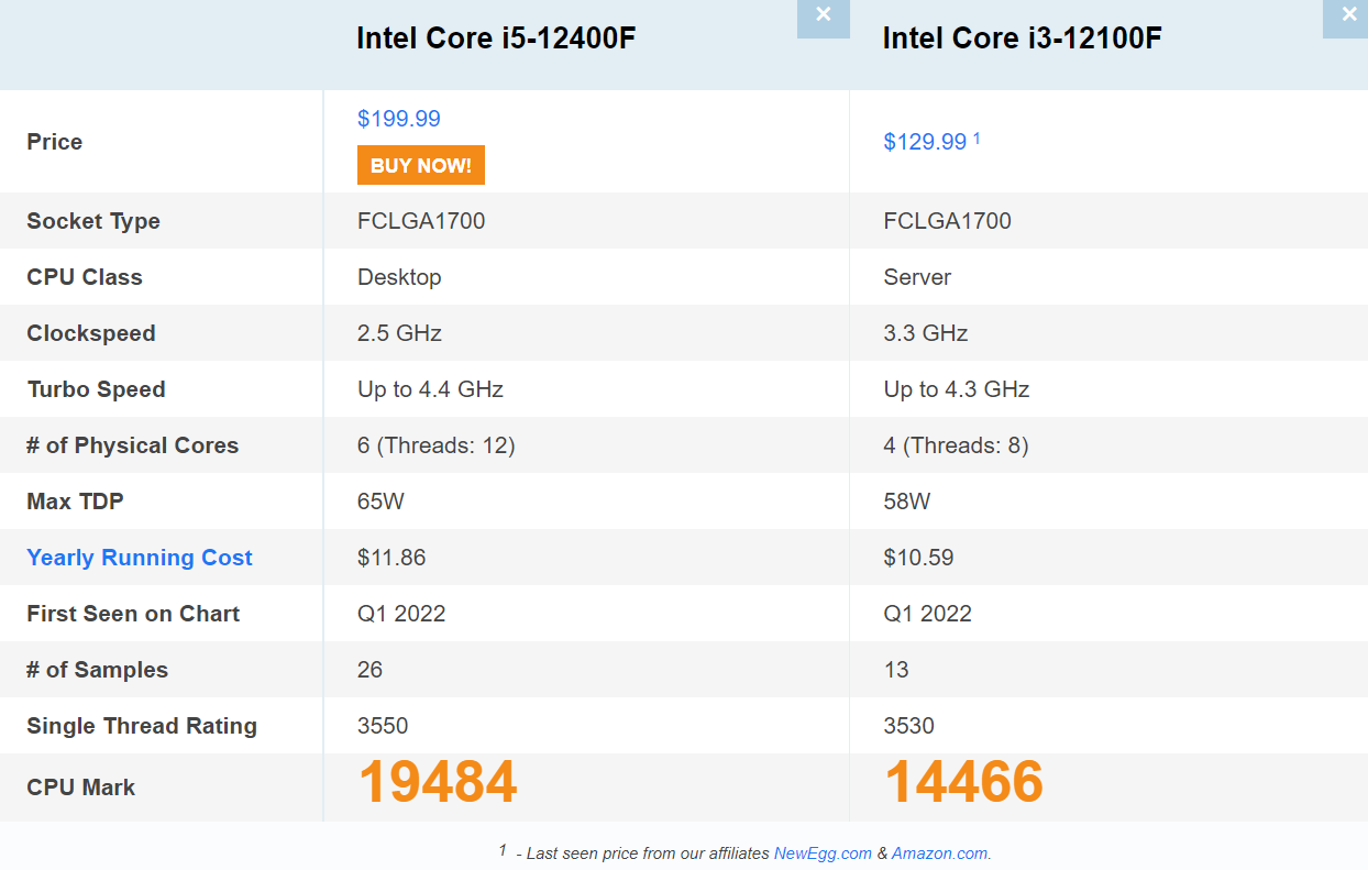 CPUbenchmark 사이트에서 비교 결과 멀티 성능에 있어서 인텔 i5-12400F가 인텔 i3-12100F보다 약 35% 우세한 것을 확인할 수 있습니다.