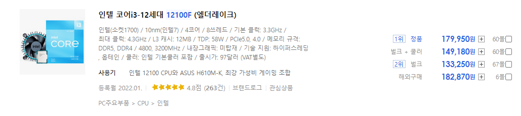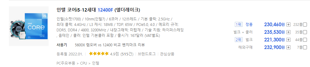 2022.02.06. 기준으로 가격 차이가 인텔 i5-12400F가 약 5만 원 더 비싼 것을 알 수 있습니다. 출시한 지 얼마 안 돼서, 인텔 i3가 출시 가에 비해 높게 잡혀 있는 것 같네요.