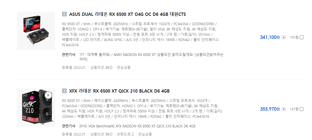 GTX1660 Super의 중고가가 50만원이 거의 되는 이 시기에, RX6500xt의 가격을 보면 천사가 따로 없을 것 같은 느낌도 나네요.