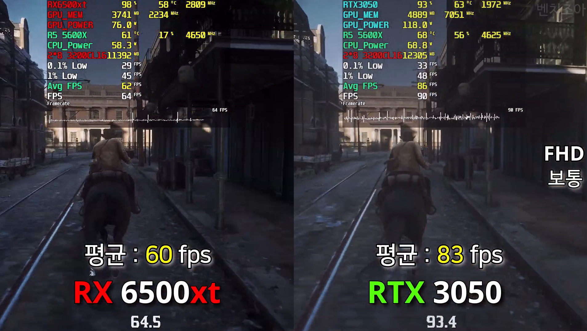 레드 데드 리뎀션2 보통 FHD 기준으로 각 평균 프레임은 60, 83으로 RTX3050이 RX6500xt보다 약 40% 우세한 성능을 보여주었습니다.