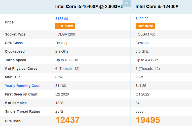 CPUbenchmark 사이트에서 비교 결과 멀티 성능에 있어서 인텔 i5-12400F가 인텔 i5-10400F보다 약 56% 우세한 것을 확인할 수 있습니다.